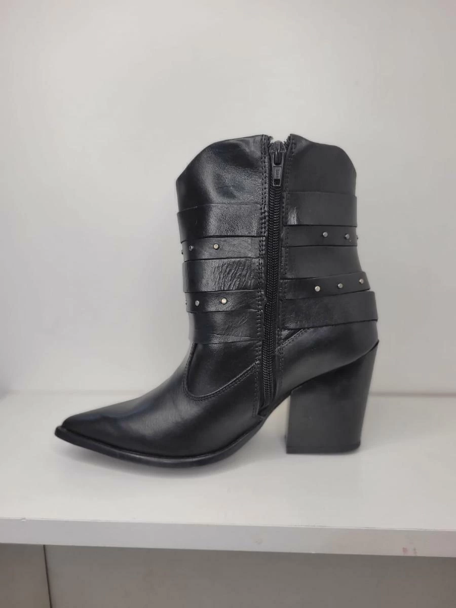 Bota estilo western com fivela decorativa e salto bloco, perfeita para quem busca personalidade e conforto em um só modelo. Com bico levemente afinado e recortes marcantes, traz o charme do faroeste em uma leitura moderna e urbana. Ideal para compor looks cheios de atitude, do jeans ao vestido.